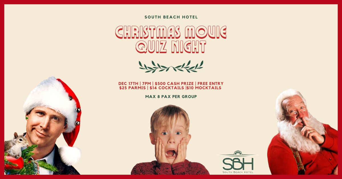 🎄 Christmas Movie Quiz at SBH on Wednesday December 17 from 7:30 PM with a $500 cash prize free entry teams up to 8 and Christmas-themed drinks for all book your table now!